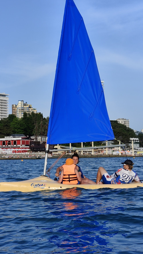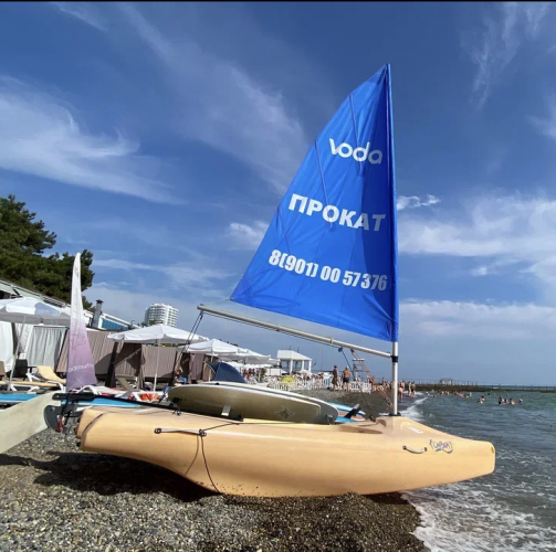 На сёрф-станции на пляже Гранд Отеля "Жемчужина" в Сочи Вам доступен в прокат популярный и удобный парусный катамаран Laser Funboat, идеально подходящий для коротких и долгих морских прогулок. С помощью него вы сможете побывать в открытом море подальше от берега и покупаться на глубине.